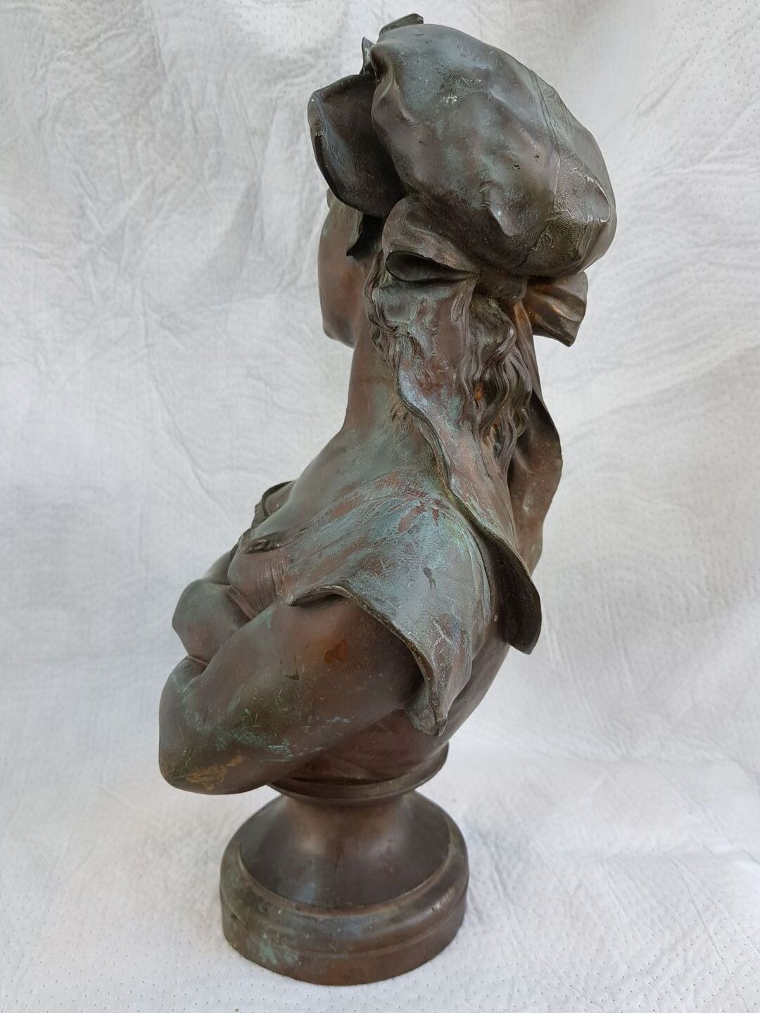 Die Büste wurde bestrahlt, kleine Kratzer und Einschläge beseitigt und große Fehlstellen in Schweißverfahren restauriert. Verformungen im Sockel wurden restauriert. Als Oberflächenfinish erhält die Büste eine dunkle Bronze Patina und wurde mit Spezialwachs versiegelt.