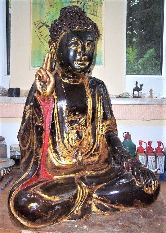 The hand was added to the Gilded Buddha. In the course of our work as an art restorer we have replaced countless lost parts of art objects, such as an arm, a leg, a hand, a wing, or anything that was held in the hand: a basket, a fishing rod, a rifle or a musical instrument. That is why we are able to offer you a very good price-performance ratio for the restoration of your property. Let us prepare a cost estimate for you under the menu item Service.
