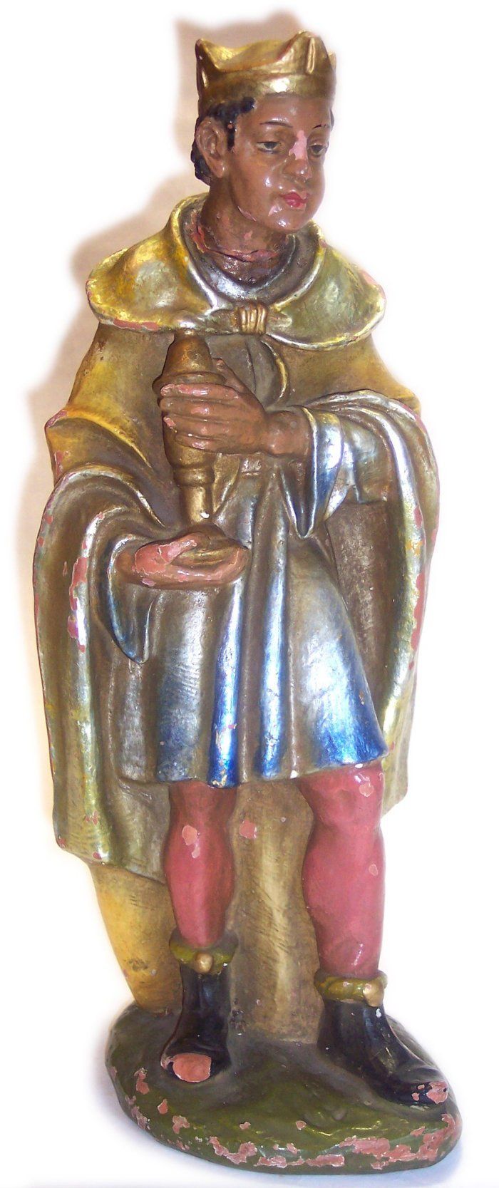 From 1940 AD. One of the 25 clay figures of the Catholic parish Mariae Himmelfahrt from 35274 Kirchhain. Read the feedback from customers about the restoration of this object, guest book page 18. We have restored a total of 25 nativity scenes from the parish of Emsdorf. These are made of clay and artistically painted. As an example, we have set three of these figures here. All 25 figures showed more and less damage, breaks, chipping, missing organs (such as ears, fingers, etc.). In addition, the lacquer layer on some of the figures was very porous and had little adhesion to the ground. Therefore the porous varnish was removed from the figures. The figures were then painted true to the original and then preserved. The preservation acts like a protective shield and protects the figures against external environmental influences.