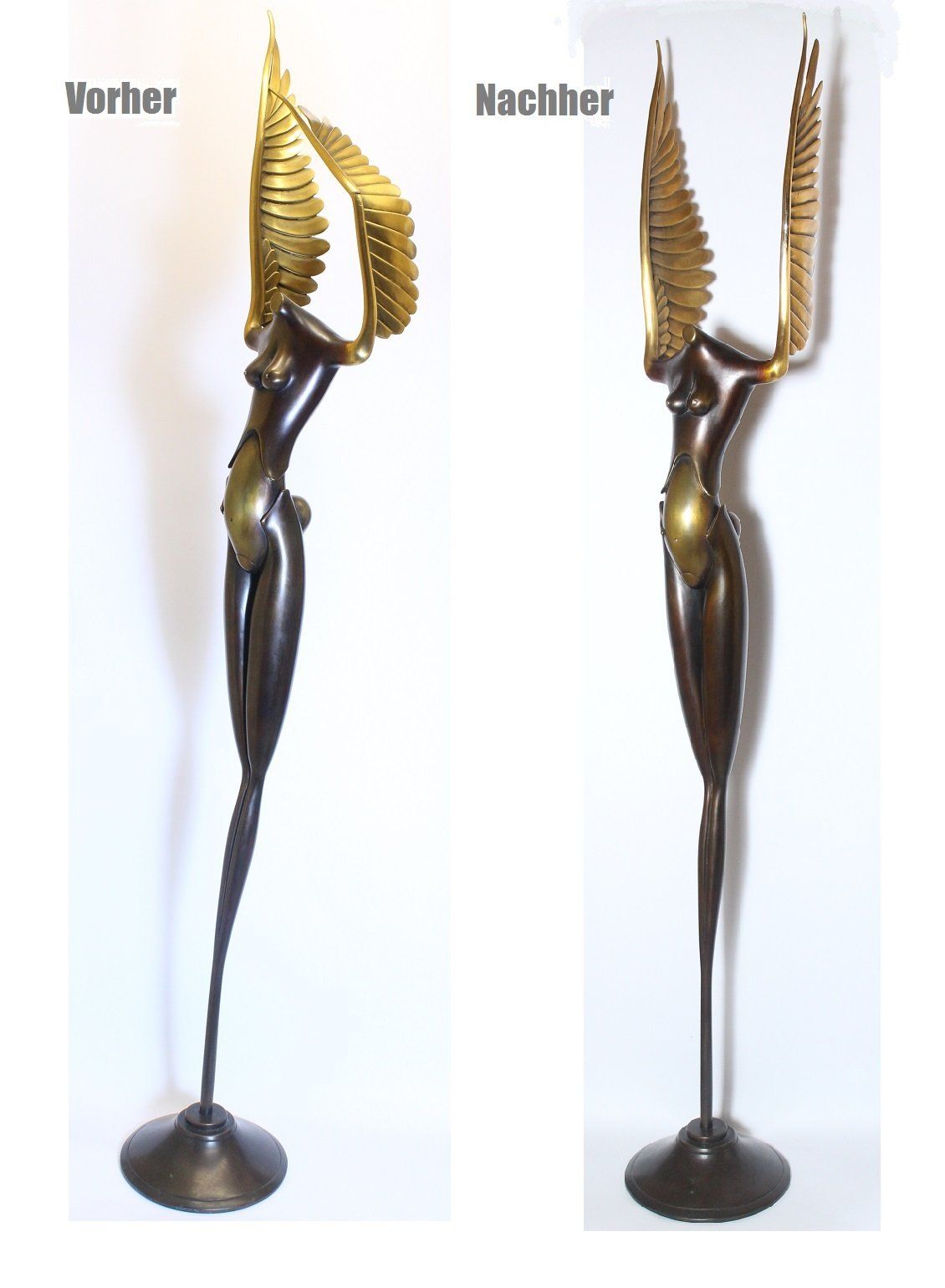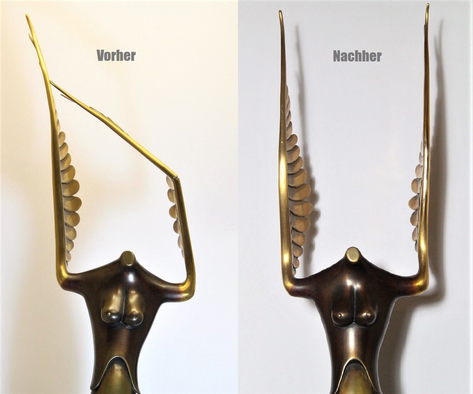The sculpture has a size of 90 cm. This proved subsequent damage as a result of a fall. Warping in the lower part of the sculpture. Severe bending and fracture of the right wing. The figure was judged in its original form. The break point is welded, polished and color-matched / patinated. Here is the feedback from the customer (from Hamburg) after receiving the bronze figure: The sculpture arrived on Wednesday and is in fantastic condition. Once again a great job from you, thank you very much!
