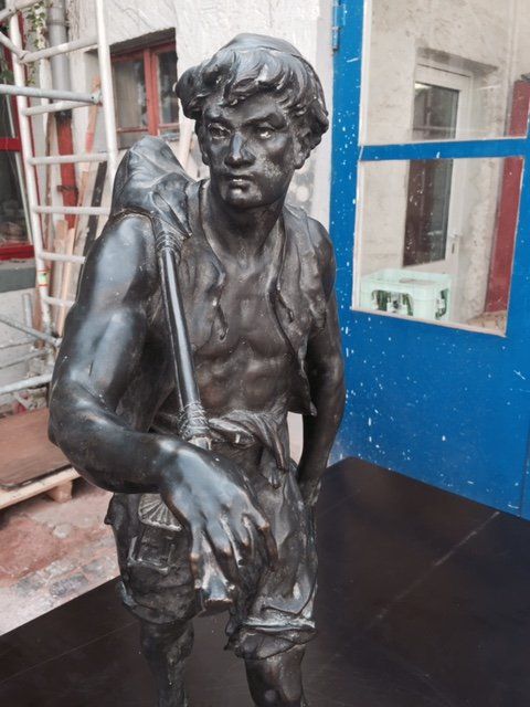 Dieser Mann ist großartig! Wir besitzen eine alte Bronzeplastik eines Bergmanns aus der Hand des Bildhauers Johann Friedrich Reusch (1843 - 1906), die 1893 datiert ist. Die Figur ("Henner") hat eine bewegte Geschichte und wurde um 1930 einem Assessor des Bergfachs in Essen zum Dienstjubiläum verehrt. Während der Kriegswirren war die Bronzeplastik in einem Bergwerksstollen untergebracht und diente nach dem 2. Weltkrieg zeitweise als Außendekoration. Die Oberfläche war stark verwittert und Kalksinter hatte einen weiteren Beitrag zur Korrosion geleistet. Zudem war die Spitze der Hacke abgebrochen und verloren gegangen.