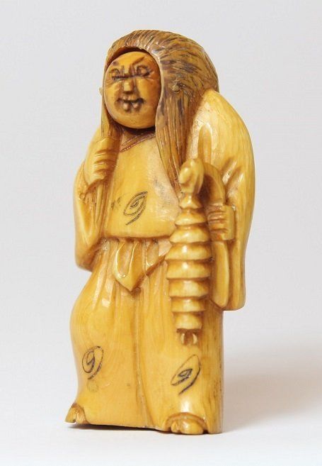 Elfenbein-Netsuke “Maske aus dem No-Theater” Der Kopf ist beweglich , hierdurch hat die Figur wechselweise ein freundliches oder grimmiges Gesicht. Japan der Edo-Zeit.