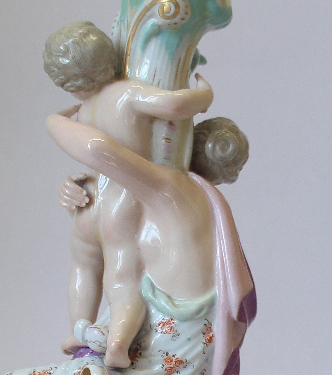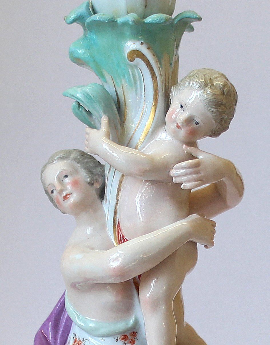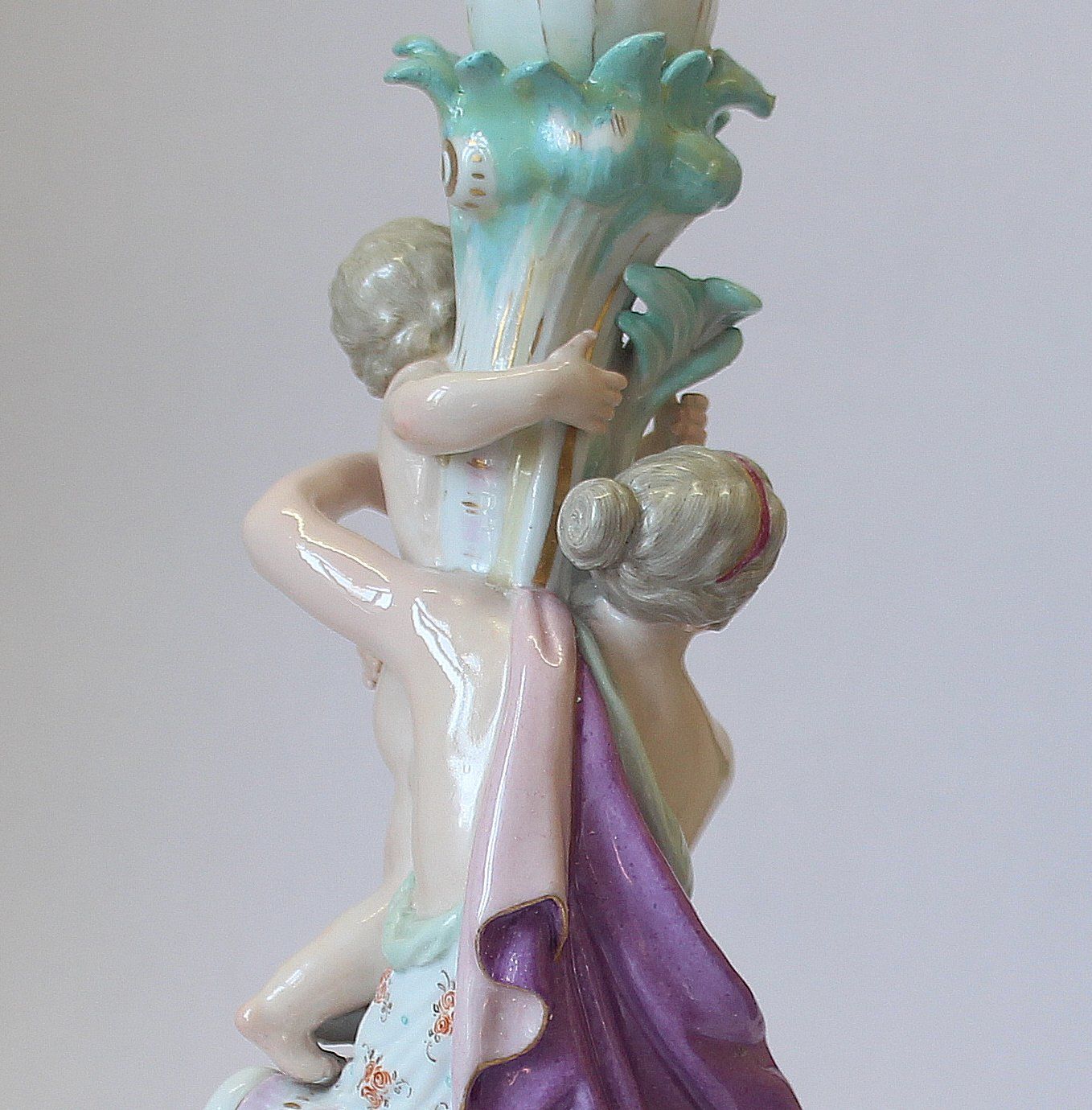 Der Kerzenleuchter aus feinstem Meißener Porzellan war in vielen Teilen zerbrochen. Besonders anspruchsvoll ist bei so einer Restaurierung die Zuordnung und das Zusammenfügen der zahlreichen sehr kleinen Scherben. Dazu kommt noch, die Reparatur so durchzuführen, dass hinterher alles unsichtbar bleibt.