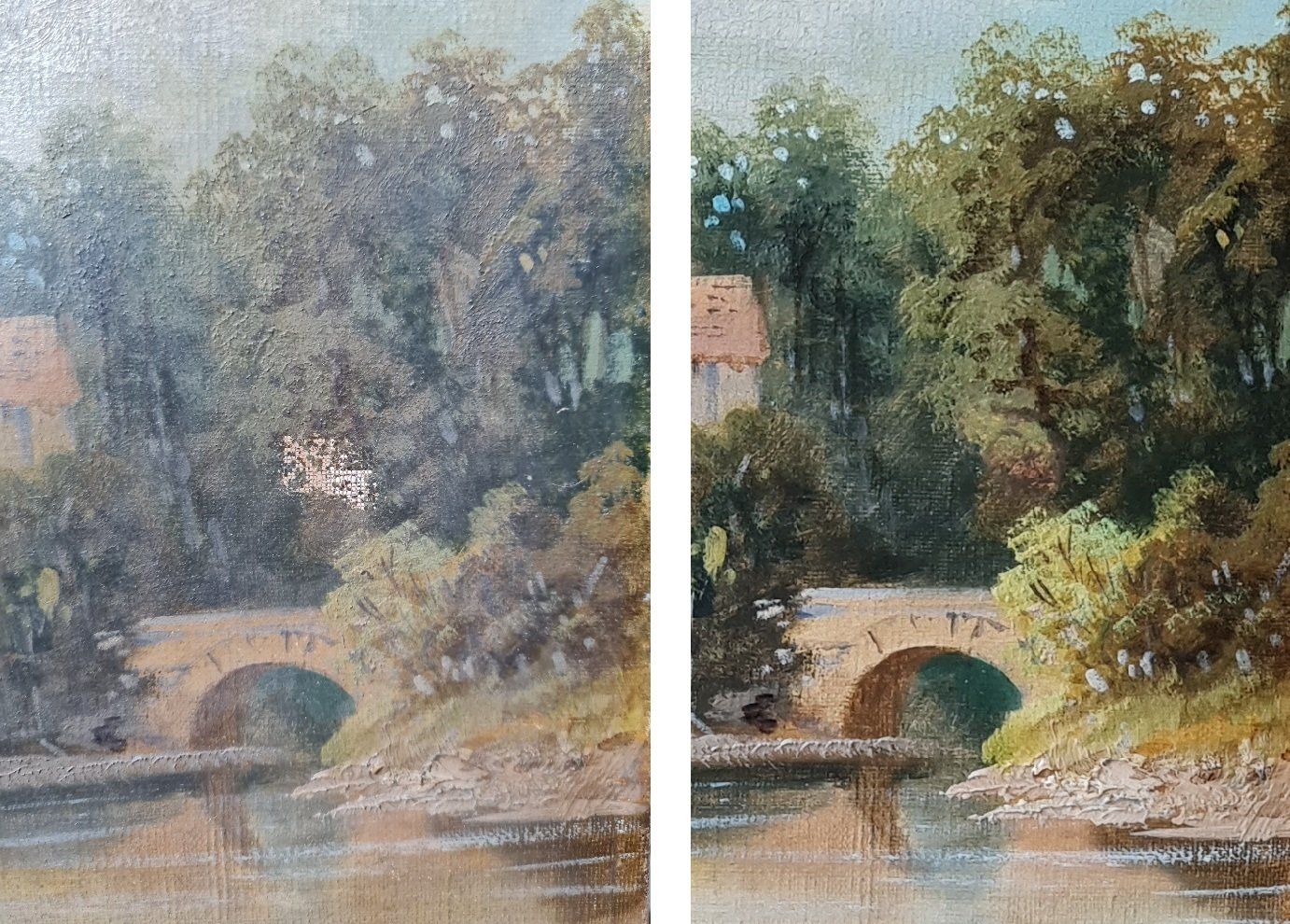 Das Ölgemälde wurde dubliert und mit einem neuen Keilrahmen ausgestattet. Risse, Fehlstellen und Löcher wurden sauber gespachtelt und retuschiert. Wir haben außerdem das Gemälde intensiv gereinigt. Nach der Reinigung haben wir es mit Gemälde Schlussfirnis versiegelt. Der neue Firnis schützt die Oberfläche, frischt die Farbe auf und ist ein UV- Schutz.